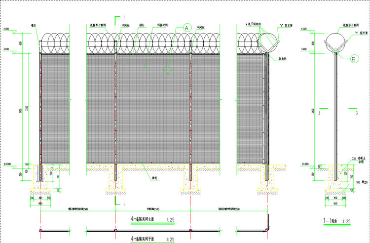 8、监狱隔离网基础采用C30混凝土现浇(可预制),预留150*150*500mm立柱埋入孔,立柱埋入后二次浇筑固定,埋入深度详大样。
