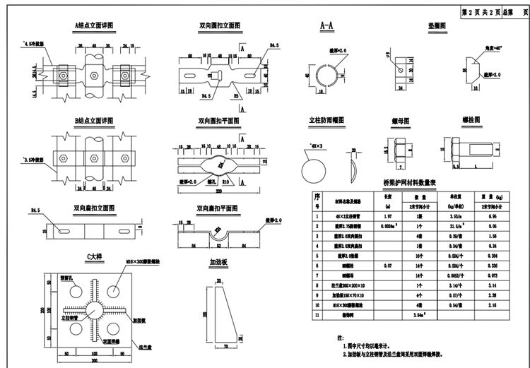 6、本图为双圈护栏网构造参考图,当双圈护栏网型式、高度、立柱型式等发生变化时,应根据实际情况提走恶化那个双圈护栏网与桥梁护栏的连接形式。