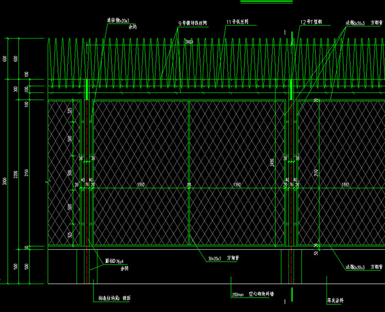 7、刀片刺绳防攀爬围网围墙每隔一皮砌块在水平灰灰缝内配2张Φ6mm焊接钢筋网片,分布钢筋Φ6@400。