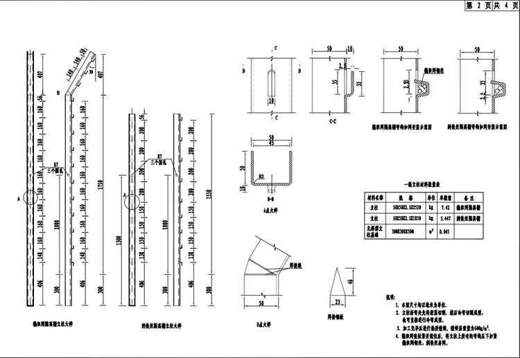 编织网隔离栅的立柱采用冷弯等边槽钢,编织网孔尺寸160*80mm,立柱间距为3m。每隔99m设置一处三向斜撑,凡拐角处均应设置单向斜撑。在跨越天然障碍时,编织网隔离栅的端头立柱均应设置垂直双向斜撑。编织网隔离栅的所有钢构件均应进行热浸镀锌处理,立柱、斜撑等构件的镀锌量为600g/㎡,螺栓、螺母等连接件的镀锌量为350g/㎡,钢丝的镀锌量为120g/㎡。热浸镀锌所用的锌应为《锌锭》(GB470-2008)中所规定的Zn99.995号锌。浸塑材料采用聚乙烯(PE)高分子涂料,立柱、斜撑浸塑层厚度>0.25mm,网片浸塑层厚度>0.15mm,颜色为绿色,全线色号应统一。防腐要求须满足《公路交通工程钢构件防腐技术条件》(GB/T 18226-2015)的规定,涂层性能应满足《公路用防腐蚀粉末涂料及涂层》(JT/T600.1-2004~JT/T600.4-2004)的规定和要求。立柱基础采用 C20 预制素混凝土,斜撑基础为 C20 现浇素混凝土。