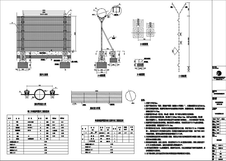 7.图中钢筋网围界形式仅为示意,具体形式以招标确定的围界形式为准,净高不应小于2.5m (不包括刺丝笼)。钢筋网围界的具体尺寸和安装形式应符合《民用航空运输机场安全保卫设施》(MH/T7003 2008)中的相关规定。钢筋网围界的金属构件整体防腐年限应不小于10年。