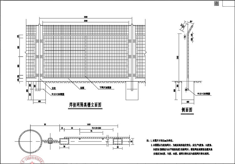 热浸镀锌浸塑焊接网片隔离栅安装过程中首先将从立柱端部开始牢固安装到立柱的挂钩上;或将网片安装在框架内,框架与立柱连接应牢固。其特有的结构既可以方便运输和施工, 又在防盗能力上有很大提高,并且更加适合地面高低起伏和平曲线小半径路段。隔离设施的安装施工一般宜在路基施工完成以后,在不影响工程施工的情况下,应尽早开始。安装施工前应做出详细的施工组织设计。隔离栅应严格按图纸要求及实际地形地物的情况进行施工放样,定出立柱中心线进行必要的清场和挖除树根以便按规定的坡度和线形修建隔离栅。立柱的埋设,应分段进行,先埋两端的立柱,然后拉线埋设中间立柱,从纵向看,立柱的轴线应在一条直线上,不得出现参差不齐的现象,从高度看,柱顶应平顺,不得出现高低不平的情况。立柱、支撑或锚头埋入混凝土基础中时,应设置必要的临时拉索或支撑, 以把立柱固定于适当位置,直到混凝土硬化为止。在混凝土养生 7d 期间,不应在立柱、拉索和支撑上安装或拉紧任何材料或部件。所有立柱均应按照图纸要求和线形垂直埋设。隔离栅安装后要求网面平整,无明显翘曲和凹凸现象。金属立柱弯曲度不得超过 8mm/m,且不得有明显变形、卷边或划伤。焊接网、 金属立柱、斜撑构件和连接件的材质、规格及防腐处理均应满足图纸要求,具有产品合格证并经工地检验后方可使用。立柱埋深应符合图纸要求。立柱与基础、隔离栅与立柱之间的连接应稳固。隔离栅起终点应符合端头封围图纸的要求。立柱和基础的混凝土强度及几何尺寸应不小于图纸要求。