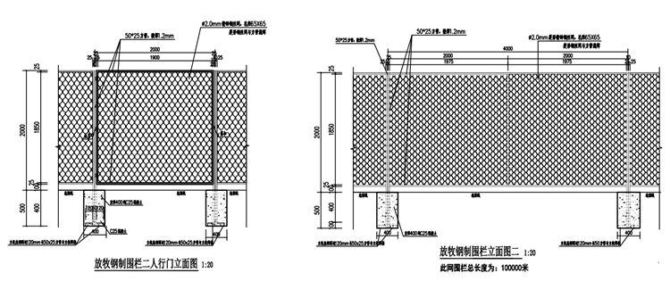 菱形网款式放牧钢制围栏一般介绍:1、立柱,方管25*50*1.2mm;2、边框,方管25*50*1.2mm;3、竖撑,方管25*50*1.2mm;4、网丝,2.0mm;5、网格,65*65mm勾花网编织网;6、高度,2000mm;7、跨距,4000mm;8、防腐工艺,镀锌。9、由于现场地形复杂,高低起伏较多,尺寸不规则,需要现场解决。