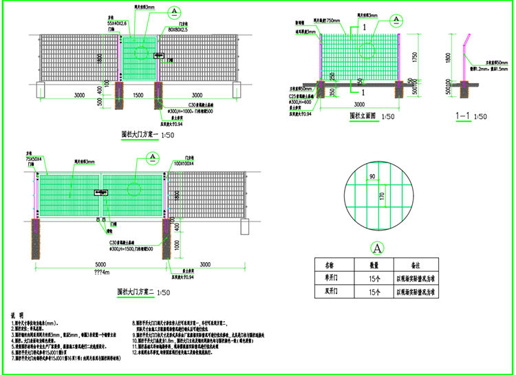 5、围栏平开大门样式参考15J001第9页,围栏开大门内部样式参考15J001第16页1项(内网片采用与围栏同样材料)。