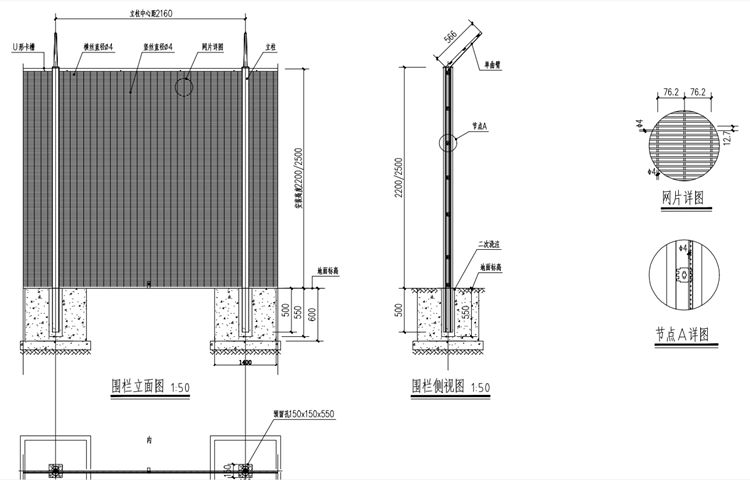 6.围栏立柱中心距为2160,安装高度为2500, 网格76.2x12.7。