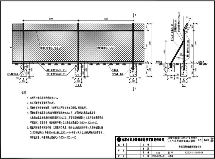 4.光伏项目钢板网围栅布置处地面压实度应达到轻型标准的90%以上,方可浇筑立柱基础混凝土;立柱基础混凝土强度达到设计强度70%以后,方可安装钢板网片;立柱与框架横梁要求牢固稳定,不易损坏,整体连接平顺;立柱混凝士基础尺寸为300x300x600。