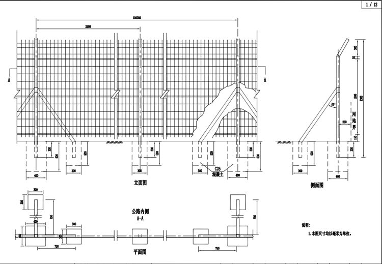 7.焊接网隔离栅沿公路用地界布置,立柱在用地界内侧25cm处。