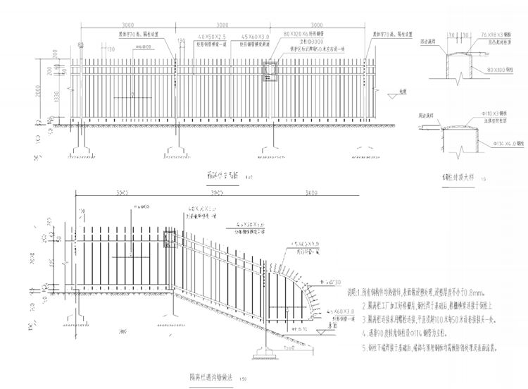 安徽合肥引江济淮工程热镀锌浸塑隔离栏专业生产厂家1.所有钢构件均热镀锌表面做浸塑处理,浸塑厚度不小于0.8mm。2.隔离栏工厂加工好格栅片,钢柱焊于基础后,格栅横梁连接于钢柱上。3.隔离栏连接采用螺栓连接,平直段超100米每50米设套接接头一处。4.遇非90度转角钢柱设Φ114钢管为立柱。5.钢柱下端焊接于基础后,端部与预埋钢板均需做防锈处理及表面涂装。