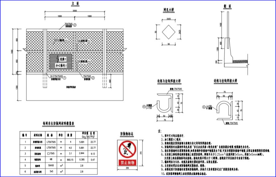 9、本图适用于防撞墙处设置的防抛物网,具体尺寸及布置形式以厂家提供资料为准。