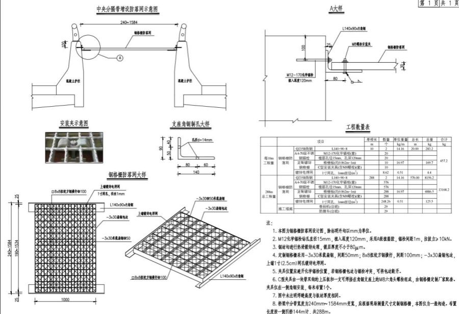 8.桥梁中分带宽度为240mm~1584mm变宽,应根据现场测量尺寸定制钢格栅,本图仅为一般构造,布置长度按一侧引桥144m计,共288m。