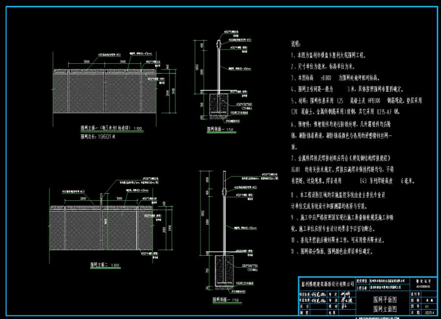 4、围网立柱间距一般为3米,具体按照围网布置图确定。