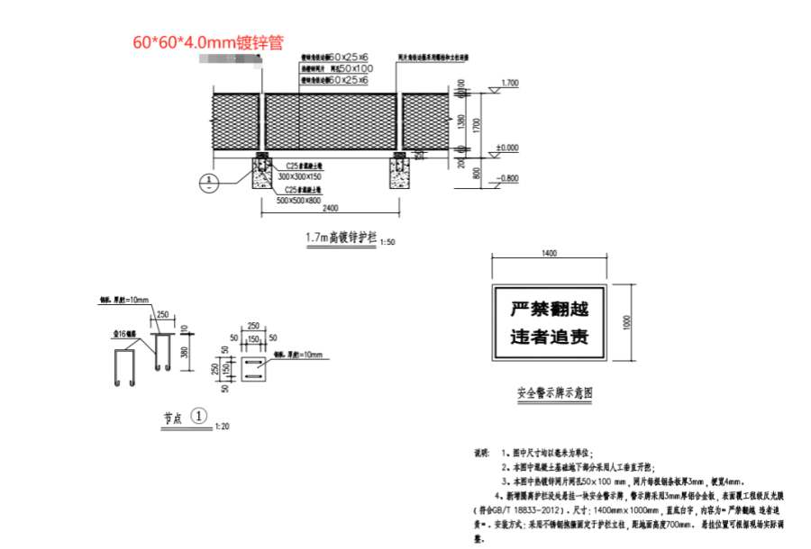 4、新增隔离护栏处悬挂一块安全警示牌,警示牌采用3mm厚铝合金板,表面工程级反光膜(符合GB/T 18833-2012)。尺寸:1400mmx1000mm,蓝底白字,内容为“严禁翻越 违者追责”,安装方式:采用不锈钢抱箍固定于护栏立柱,距地面高度700mm, 悬挂位置可根据现场实际调整。