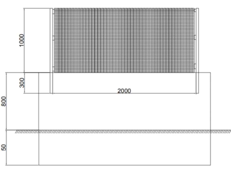 防护栏下端有宽0.3m、高1.1m混凝土作为防护栏底座,其中地上部分80cm,地下部分30cm,上部由1.0m热镀锌低碳钢防护栏组成,防护栏采用低碳钢丝焊接而成的网孔:75x150mm,尺寸:1000×2000mm,边框:20×30×1.5 mm,塑后4.8-6.0mm,立柱:48×2×2200mm,立柱预埋在混凝土底座中300mm。纵向钢梁间距2m。